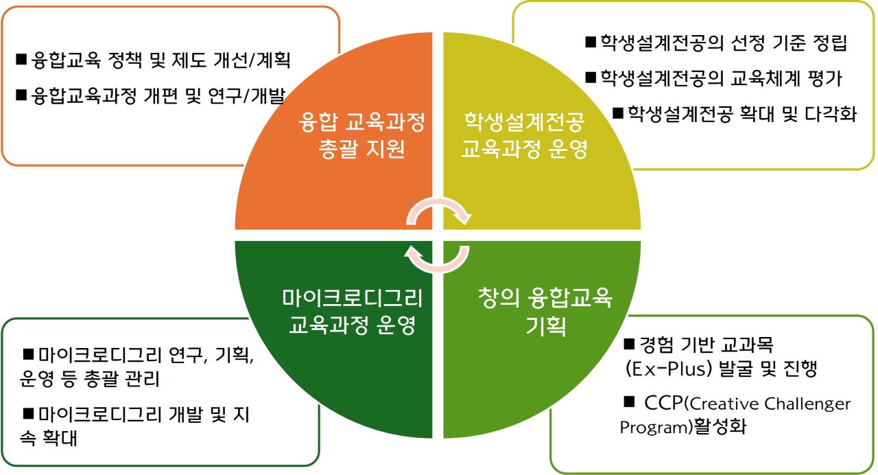 <교육과정혁신센터>는 학부대학 산하의 연구 중심 조직으로서 본교 융합 교육과정을 분석하고 이와 관련한 연구를 수행합니다. 이를 통해 교육의 최신 동향을 파악하고 연구 결과를 기반하여 실제 교육과정에 적용할 방법을 모색합니다.